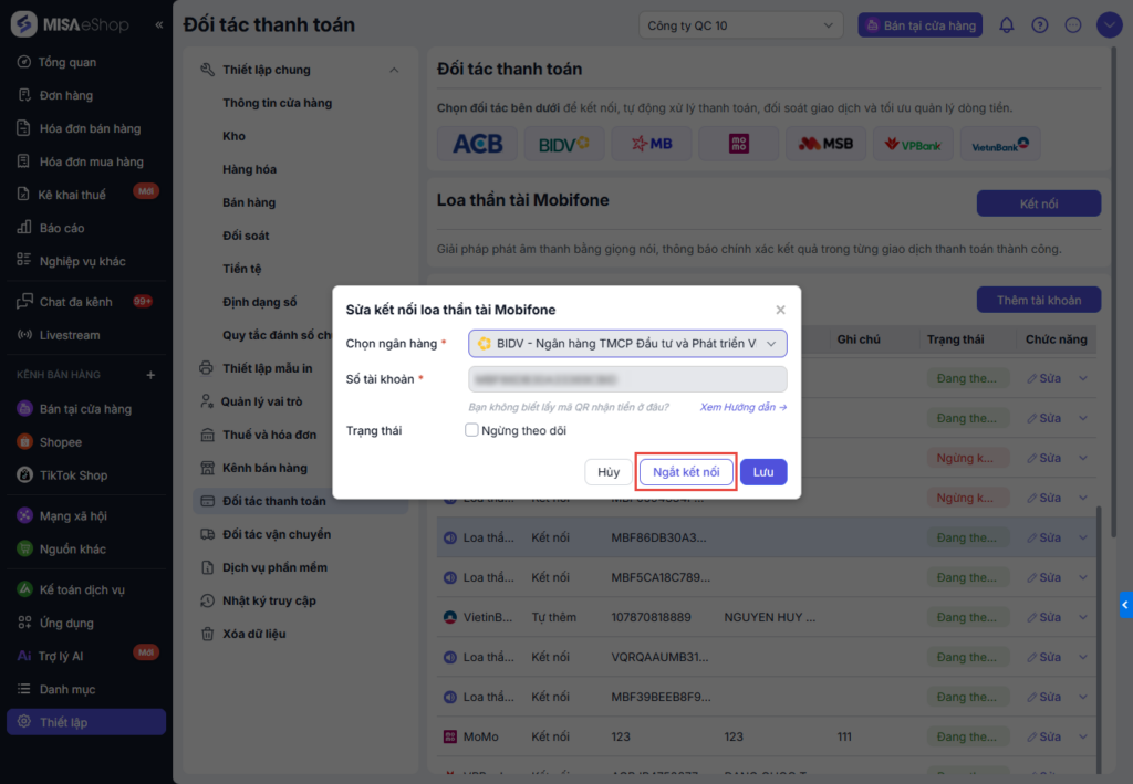 - Ngắt kết nối: Nhấn Ngắt kết nối để dừng kết nối loa thần tài Mobifone với MISA eShop.