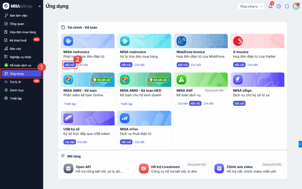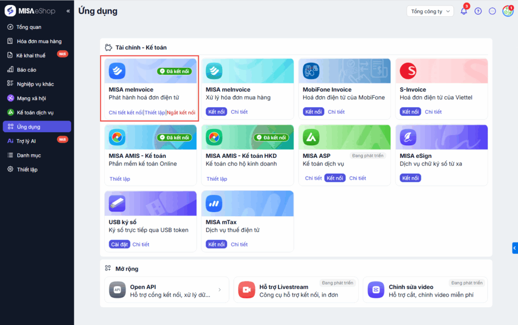 -> Sau đó nhấn Kết nối tại MISA meInvocie – Phát hành hóa đơn điện tử.