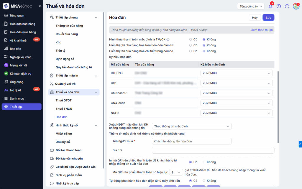 - Thiết lập Hóa đơn:
