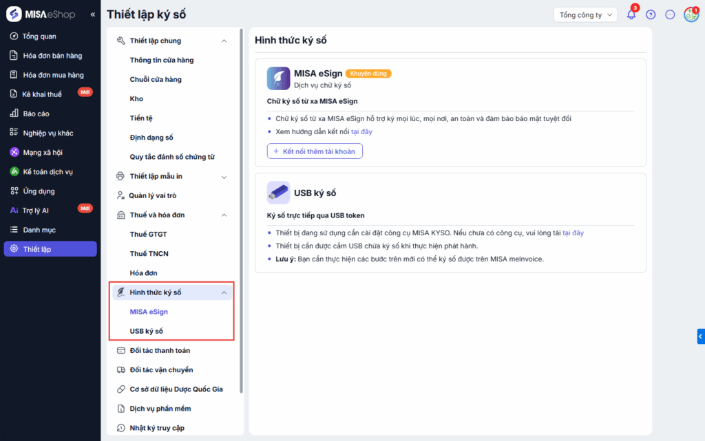 - Chưa kết nối -> Thực hiện kết nối hình thức ký số tại từng cửa hàng.