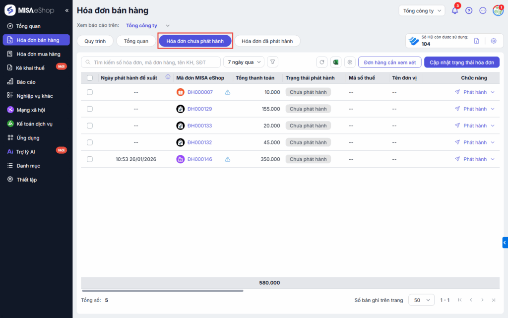 - Danh sách Hóa đơn chưa phát hành: Chỉ danh sách hóa đơn chưa phát hành của cửa hàng -> Thực hiện phát hành hóa đơn theo thiết lập riêng của từng cửa hàng.
