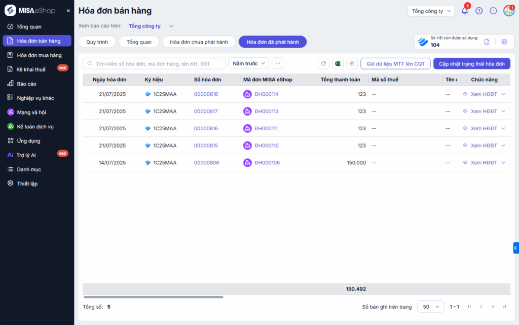 - Hệ thống tổng hợp toàn bộ các hóa đơn đã phát hành của toàn chuỗi, bổ sung thông tin liên quan đến cửa hàng áp dụng cho từng hóa đơn.