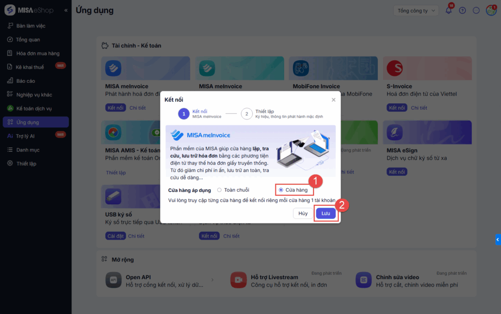 - Nếu chọn Cửa hàng: Nhấn Lưu. Sau đó, người dùng thực hiện sang truy cập từng cửa hàng và thực hiện kết nối -> Kết thúc thao tác tại đây.