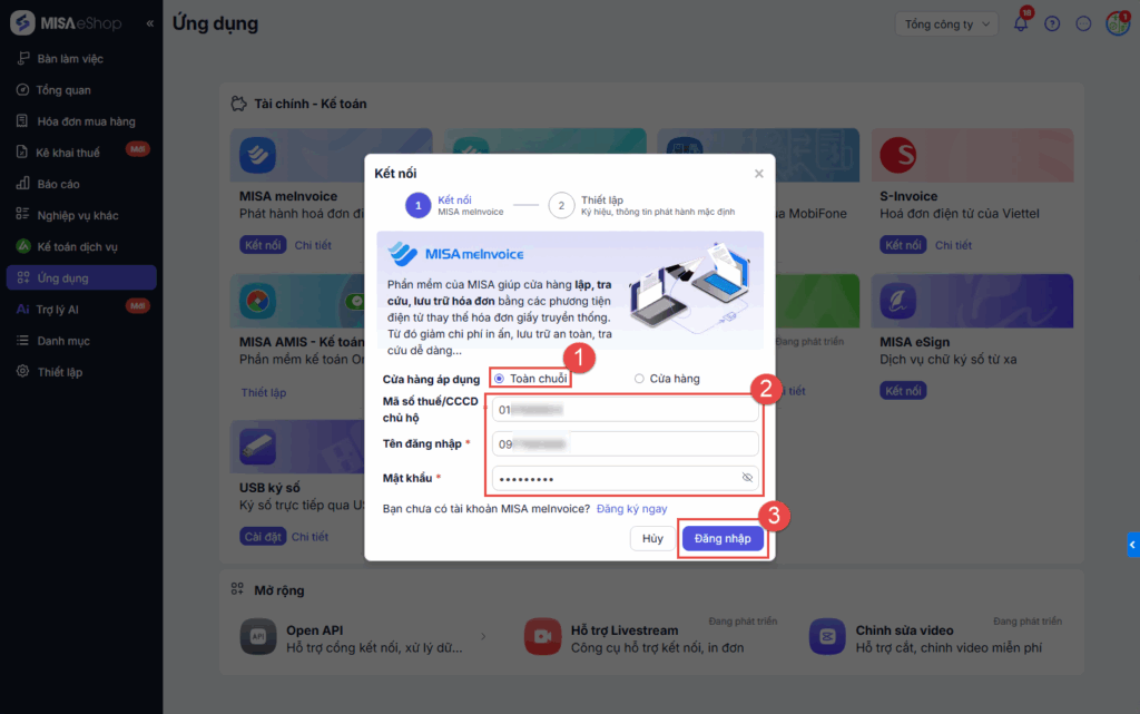 - Nếu chọn Toàn chuỗi: Người dùng điền thông tin đăng nhập tài khoản MISA meInvocie và thực hiện các bước kết nối tiếp theo.