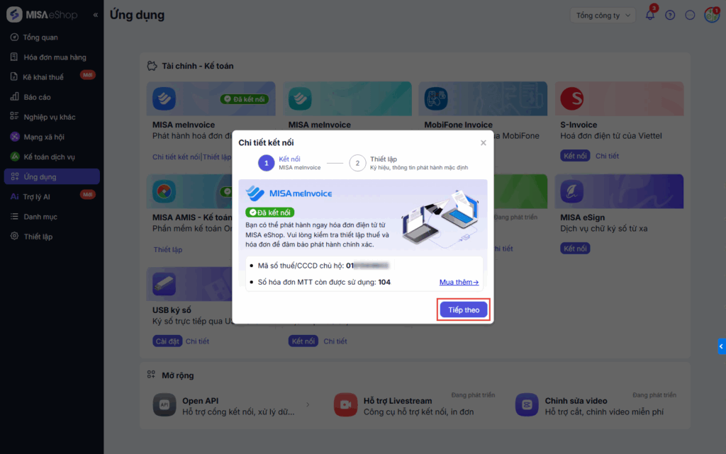 - Nếu trên Tổng công ty chưa thiết lập kết nối cho Toàn chuỗi thì người dùng này vào Ứng dụng sẽ được kết nối ứng dụng HĐĐT và sẽ lưu kết nối cho chính cửa hàng