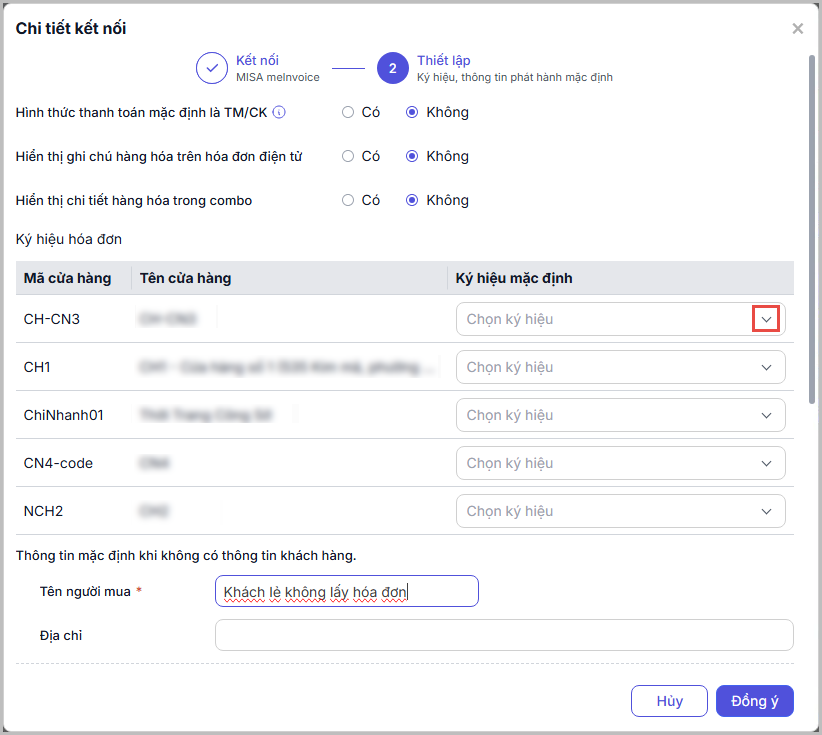 - Người dùng chọn và lưu ký hiệu mặc định theo từng cửa hàng. Thay đổi ở đây thì cũng cập nhật lên Tổng công ty. Nếu để trống ký hiệu mặc định thì show cảnh báo như hiện tại đang làm với cửa hàng đơn