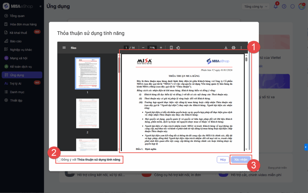 - Chọn Có: Hệ thống tự động phát hành hóa đơn điện tử. -> Lúc này hệ thống gửi thỏa thuận sử dụng tính năng, người dùng cần đọc chi tiết về thỏa thuân