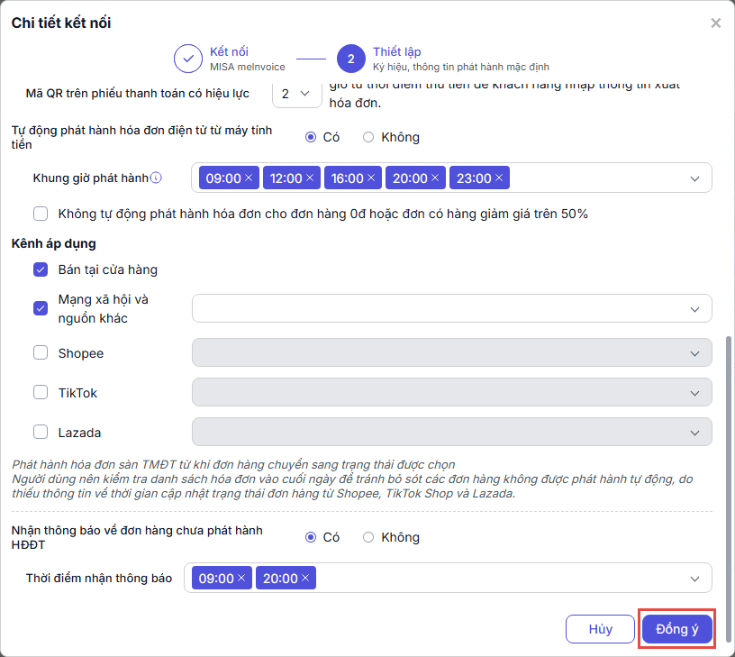 - Tích chọn Có: Chọn các thời điểm nhận thông báo trong ngày để hệ thống nhắc nhở về các đơn hàng chưa phát hành hóa đơn.