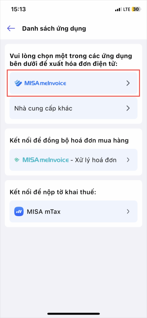 Bước 3: Chọn MISA meInvocie – Xuất hóa đơn điện tử