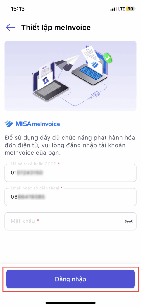 Bước 4: Nhập thông tin đăng nhập tài khoản MISA meInvoice: bao gồm mã số thuế, tên đăng nhập, mật khẩu tài khoản MISA meInvoice.