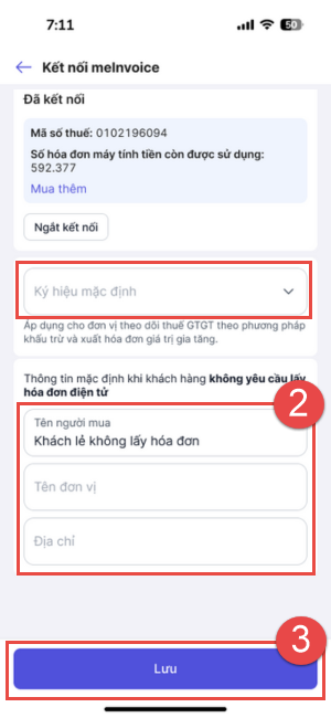 - Nhập thông tin mặc định để xuất hóa đơn khi khách hàng không yêu cầu lấy hóa đơn điện tử.