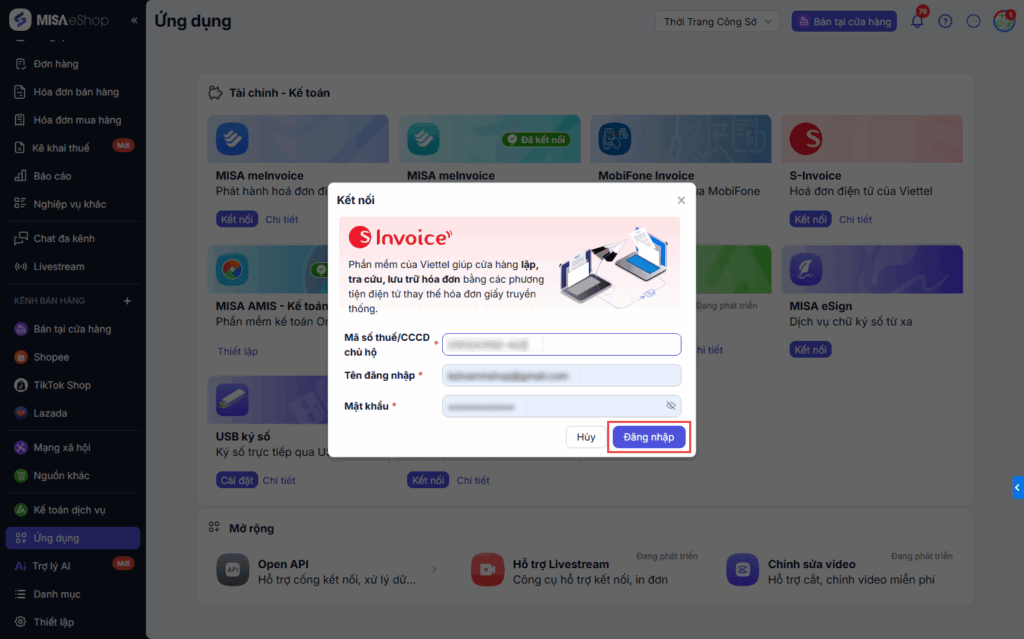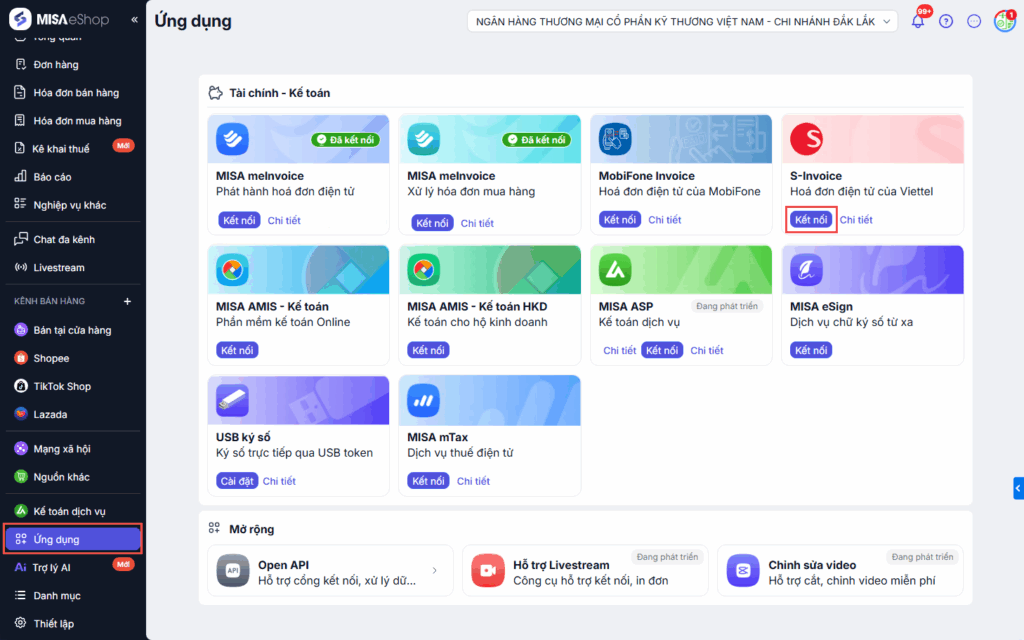 Cách 2: Truy cập trang Ứng dụng, tại S – Invoice, nhấn Kết nối