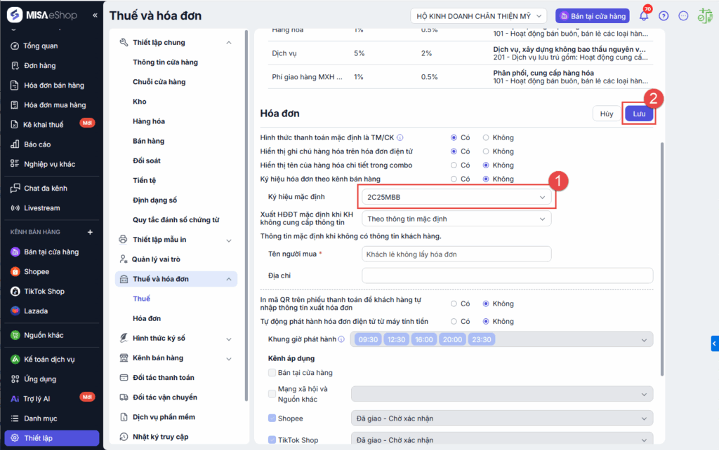 - Truy cập trang Thiết lập\Thuế & Hóa đơn\Hóa đơn -> Nhấn Sửa và chọn Ký hiệu mặc định đã được tạo trên S- Invoice -> Nhấn Lưu để hoàn tất.