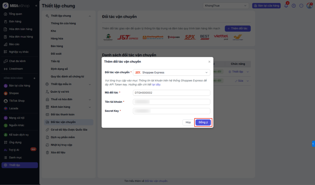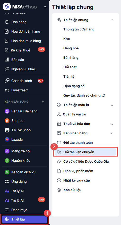 Bước 1. Truy cập Thiết lập đối tác vận chuyển