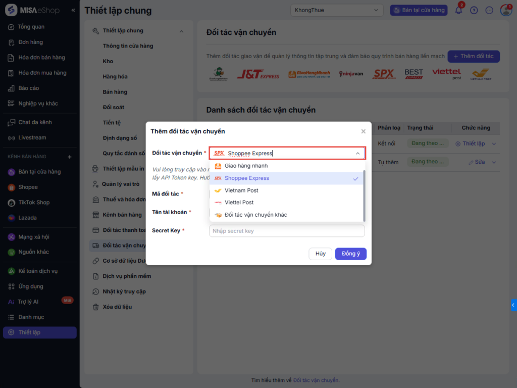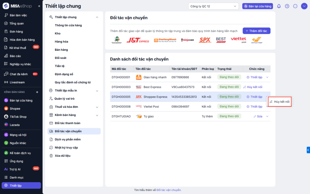 Sau khi kết nối thành công, phần mềm chuyển sang trang Thiết lập đối tác vận chuyển. Phần mềm tự động kết nối kho hàng hóa với Đơn vị vận chuyển.