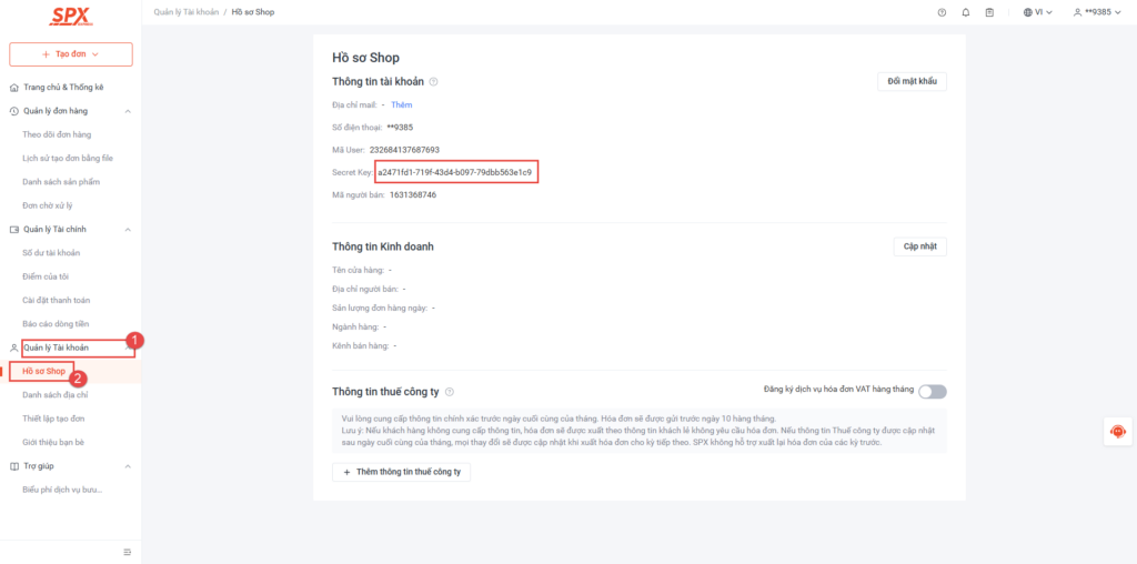 - Lấy mã API Token Key: Truy cập trang quản trị SPX Express, chọn Quản lý tài khoản\Hồ sơ shop và copy mã Secret Key.