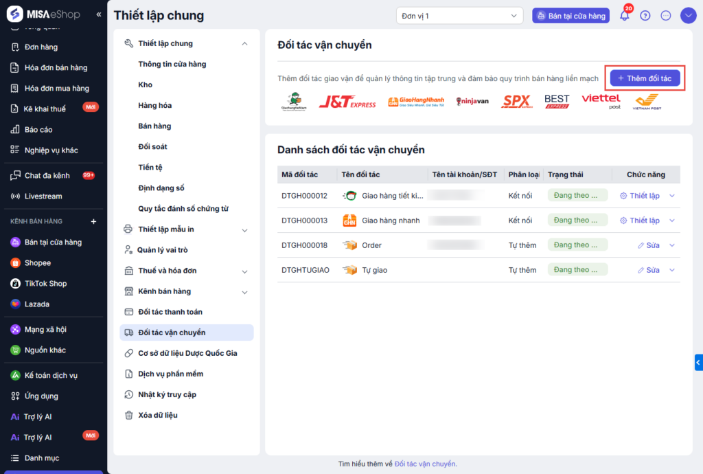 Vào Thiết lập/Đối tác vận chuyển.