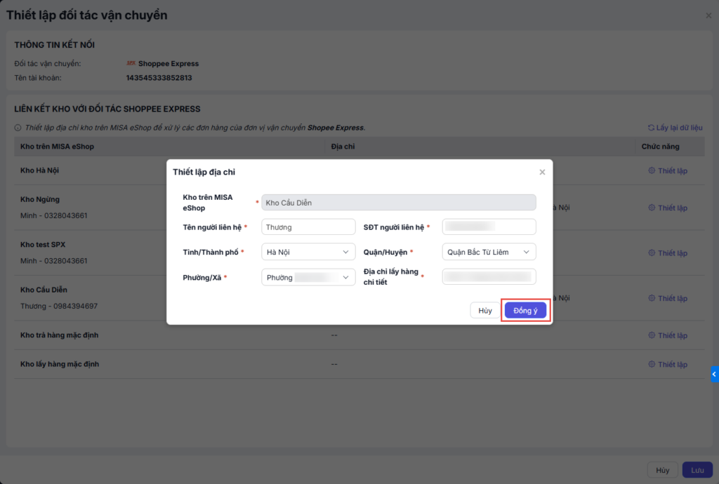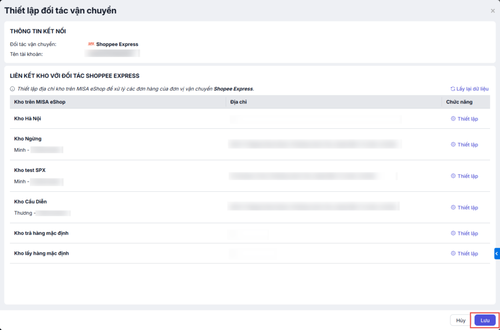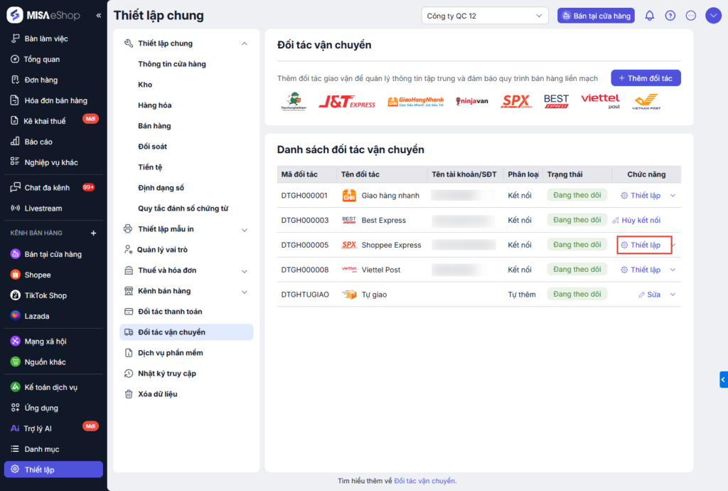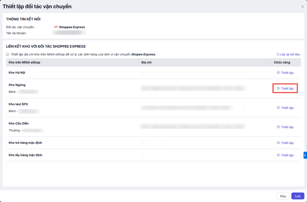 Để kiểm tra thông tin kho và địa chỉ kho, Tại dòng đối tác vận chuyển SPX Express đã kết nối, nhấn chọn Thiết lập .