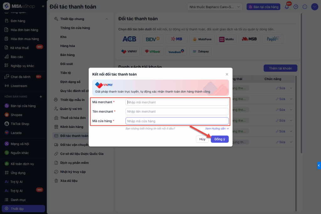 - Mỗi cửa hàng trên MISA eShop chỉ được kết nối 1 tài khoản VNPAY.