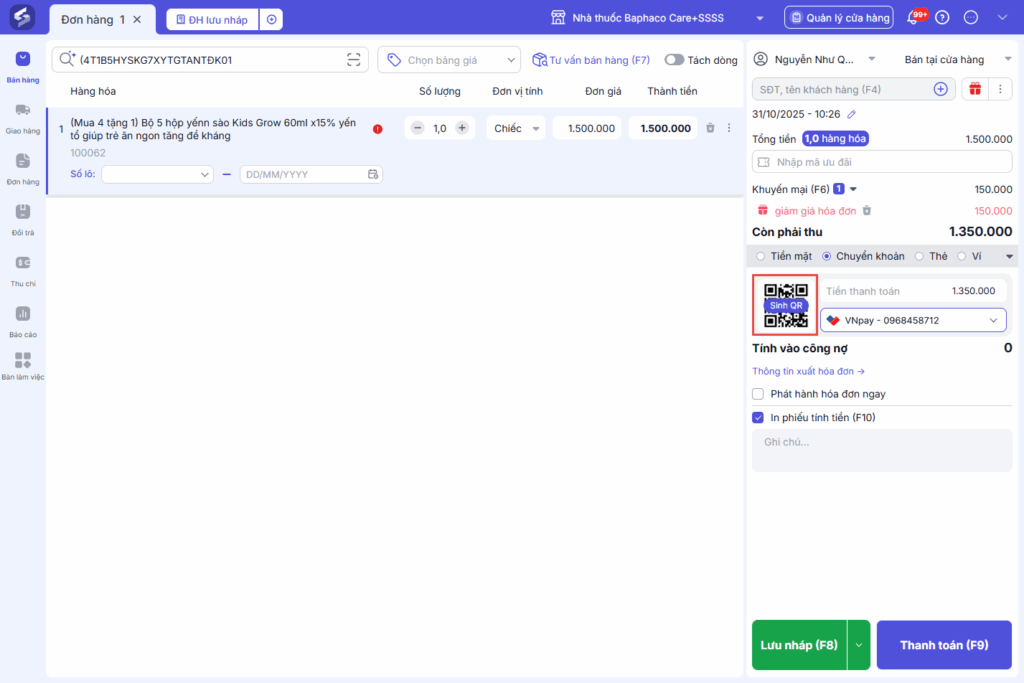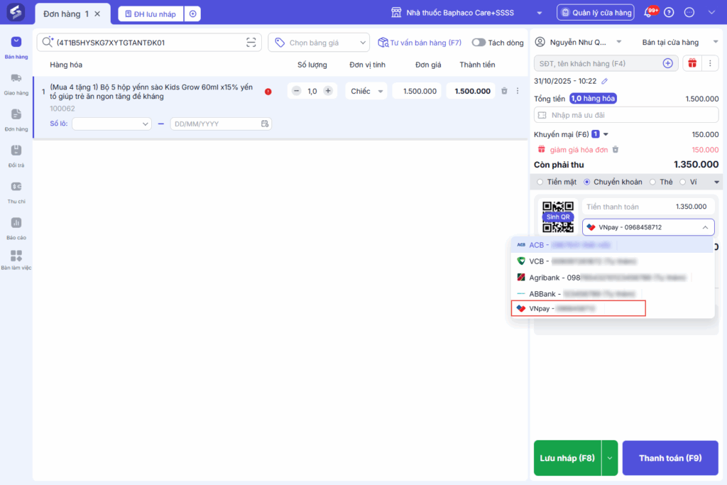 Tại màn hình bán hàng, tại mục chọn phương thức thanh toán, chọn Chuyển khoản.