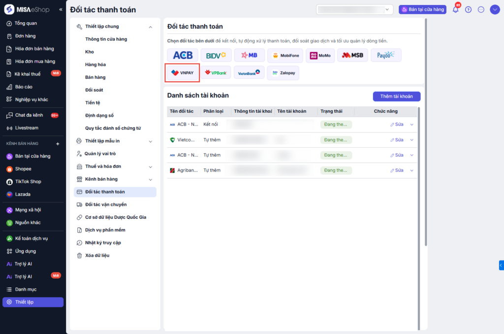 Tại màn hình quản lý, chọn Thiết lập\Đối tác thanh toán.