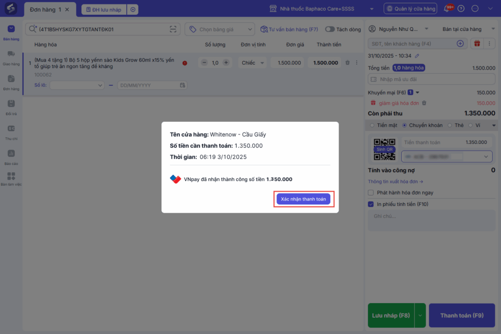 - Khi giao dịch đã ghi nhận thành công, nhấn Xác nhận thanh toán để hoàn tất.