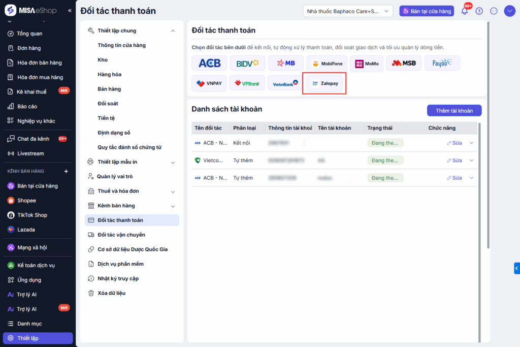 - Một cửa hàng MISA eShop có thể kết nối nhiều tài khoản ZaloPay.
