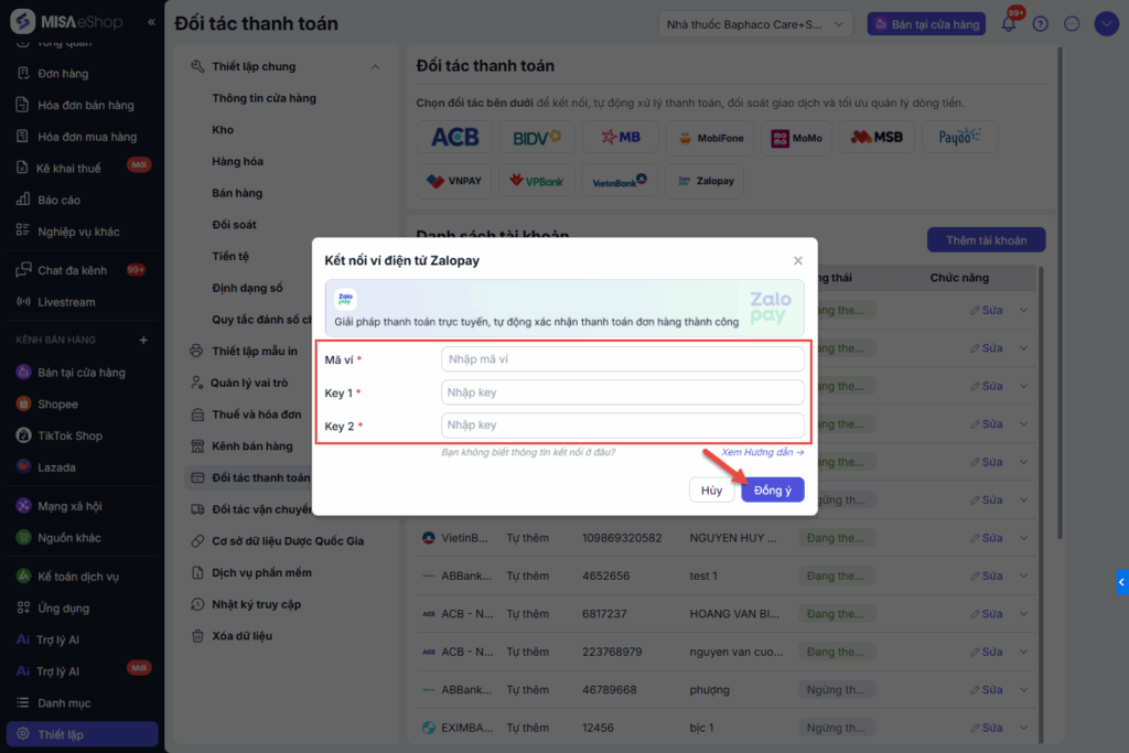 Bước 3: Nhập các thông số kết nối đã được Zalo Pay Merchant cung cấp, nhấn Đồng ý.