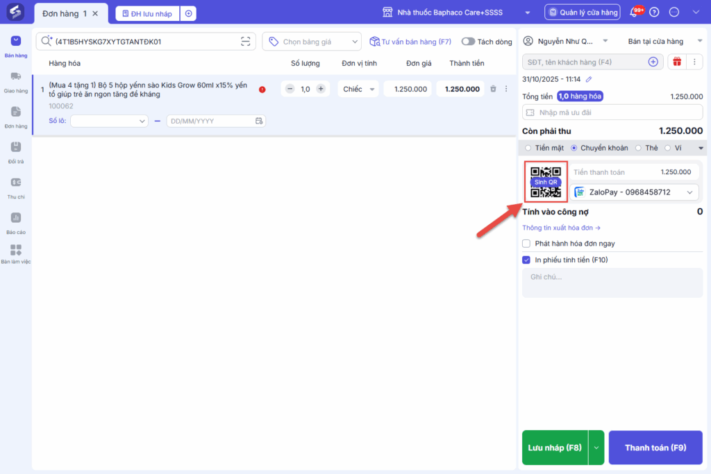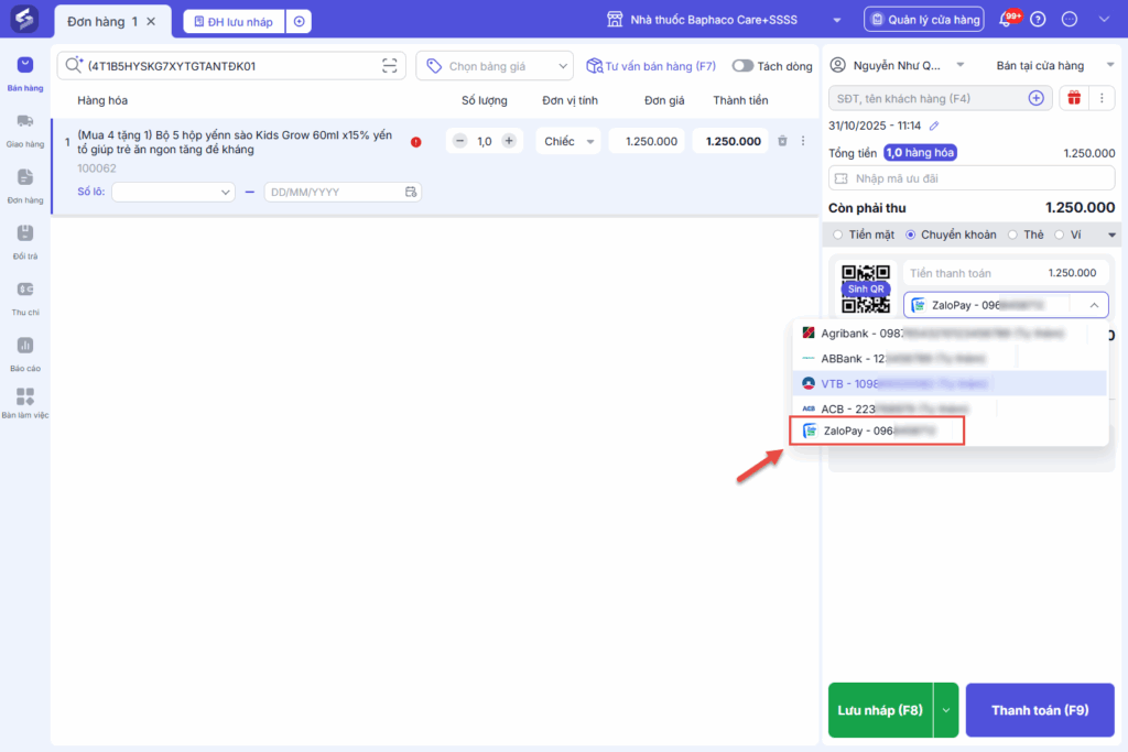 Bước 1: Tại màn hình bán hàng, tại mục chọn phương thức thanh toán, chọn Chuyển khoản.