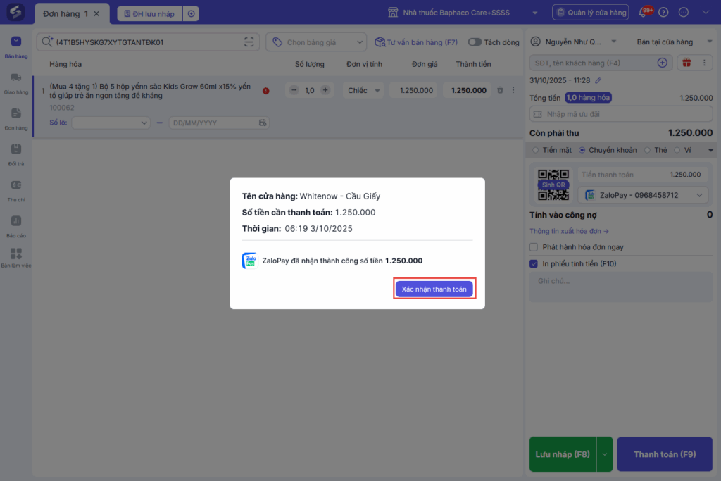 - Khi giao dịch đã ghi nhận thành công, nhấn Xác nhận thanh toán để hoàn tất.
