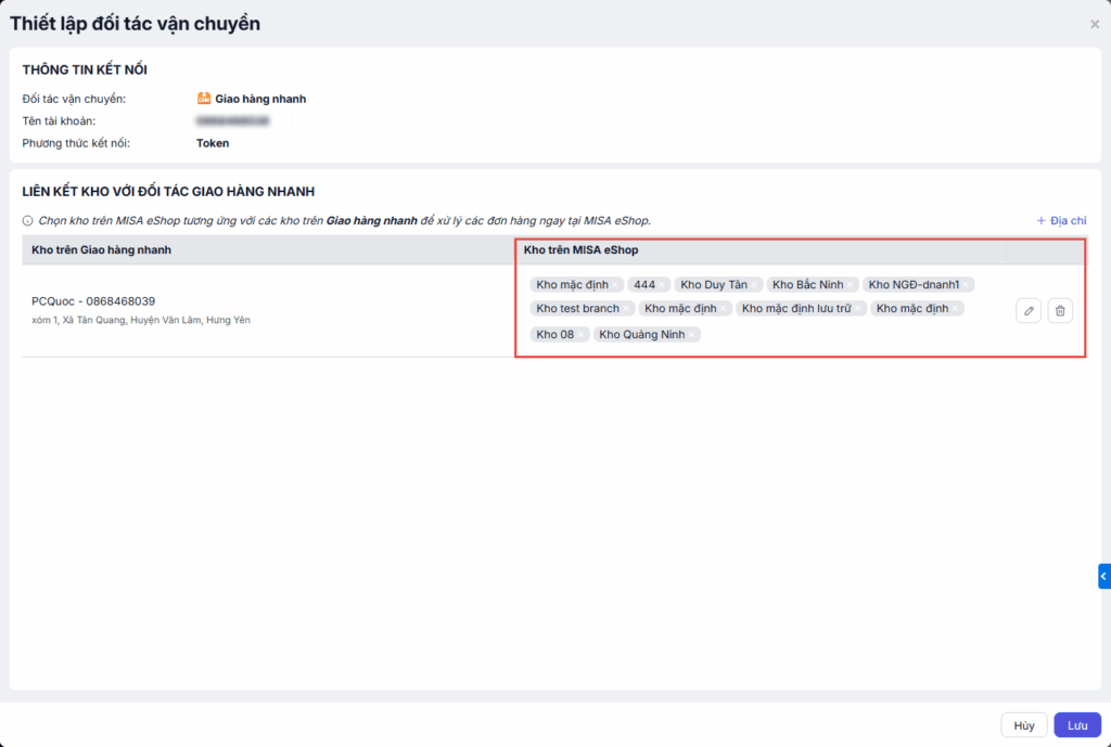 Chọn kho trên MISA eShop tương ứng với các kho trên Giao hàng nhanh để xử lý các đơn hàng ngay tại MISA eShop.