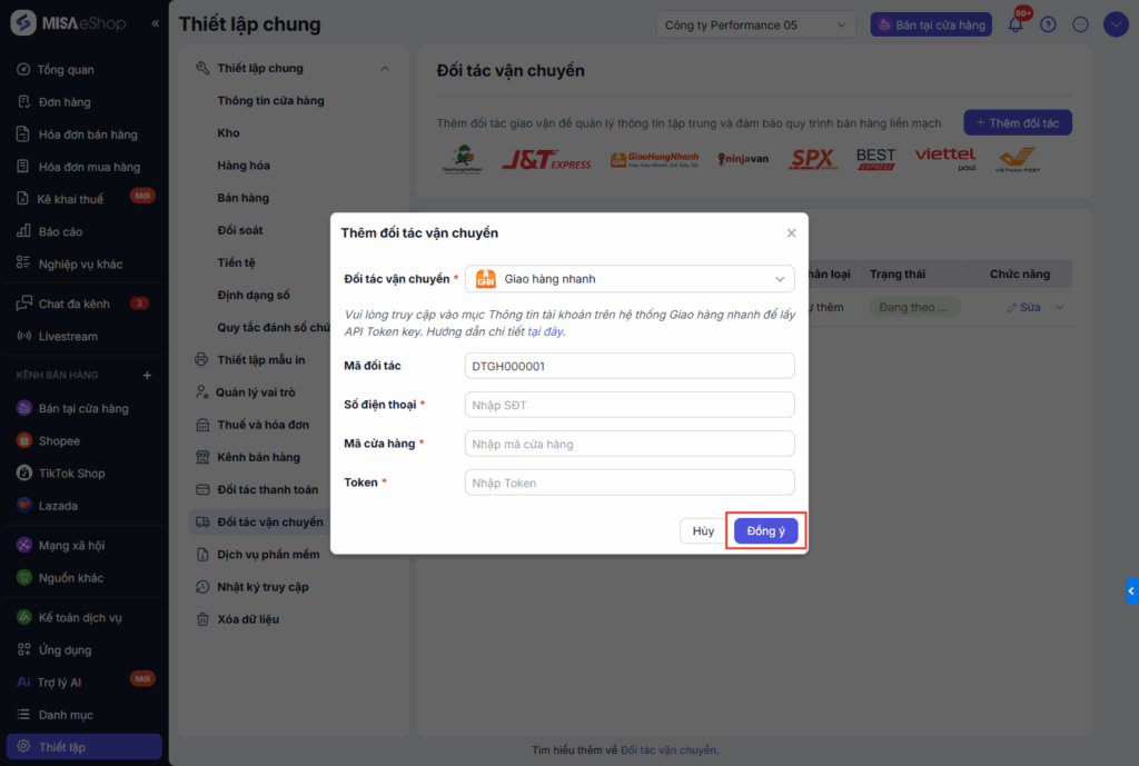 Lưu ý: Kết nối MISA eShop với đối tác giao hàng Giao hàng nhanh để đồng bộ đơn hàng từ eShop qua Giao hàng nhanh không đồng bộ ngược lại đơn thêm trên Giao hàng nhanh về eShop.