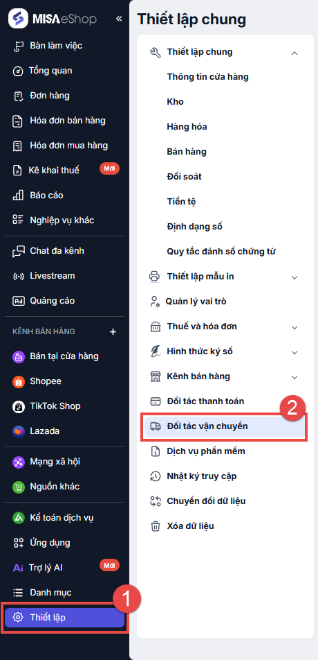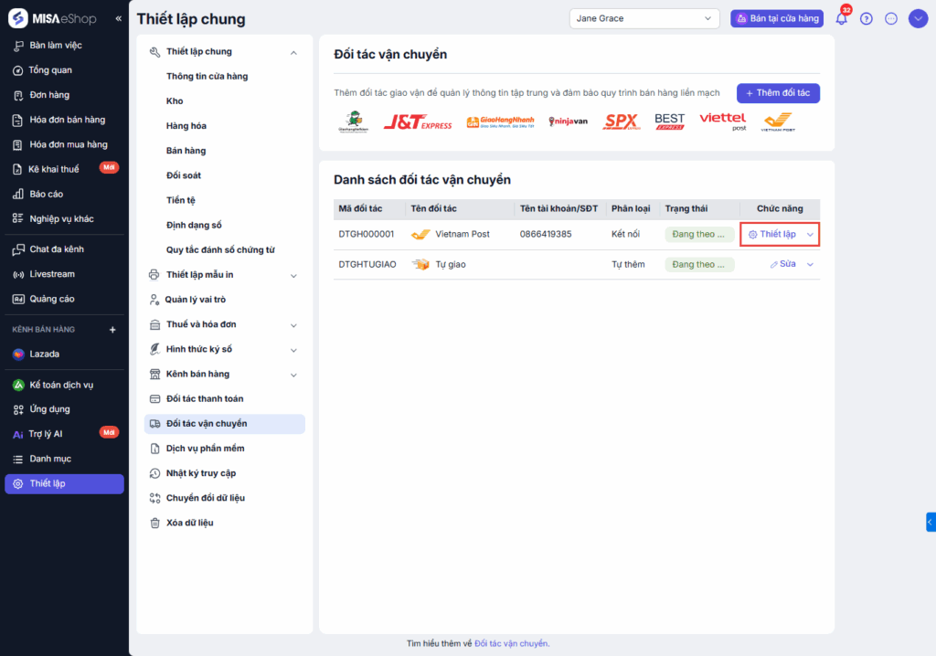 Bước 1: Tại đối tác giao hàng Vietnam Post, chọn chức năng Thiết lập.