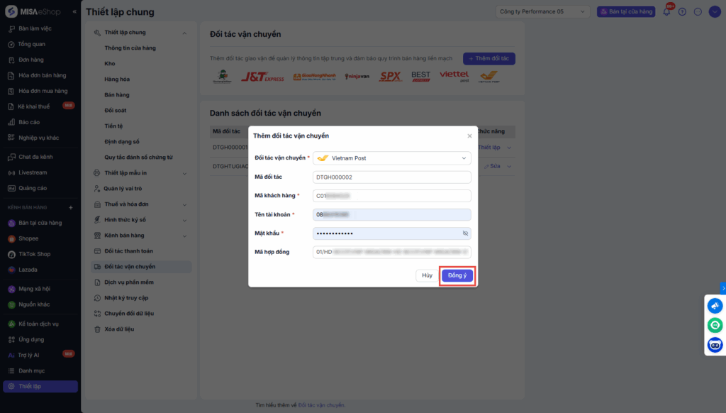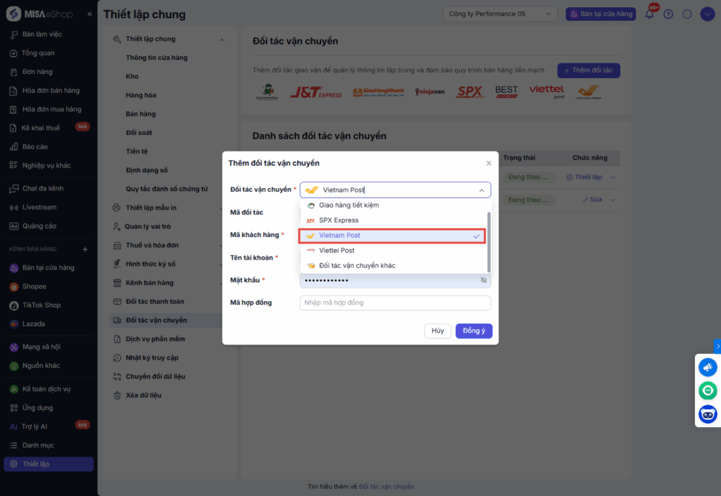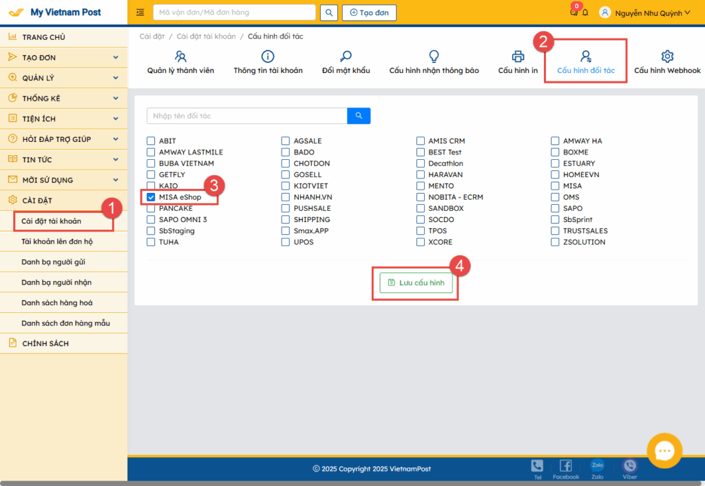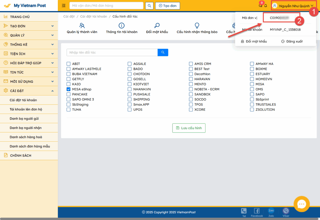 *Lưu ý: Để kết nối với VNPost, anh/chị vui lòng thực hiện cấu hình đối tác trên ứng dụng của VNPost.