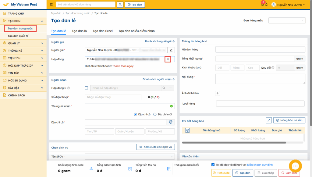 Để lấy Mã hợp đồng: Chọn Tạo đơn\Tạo đơn trong nước, nhấn biểu tượng sao chép để sao chép mã hợp đồng.