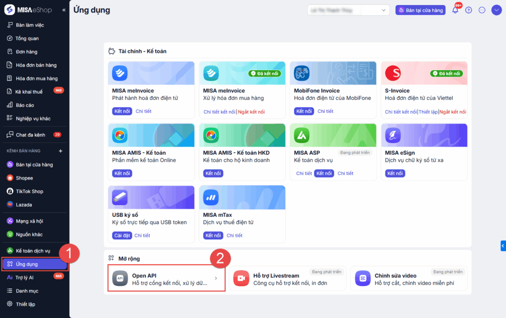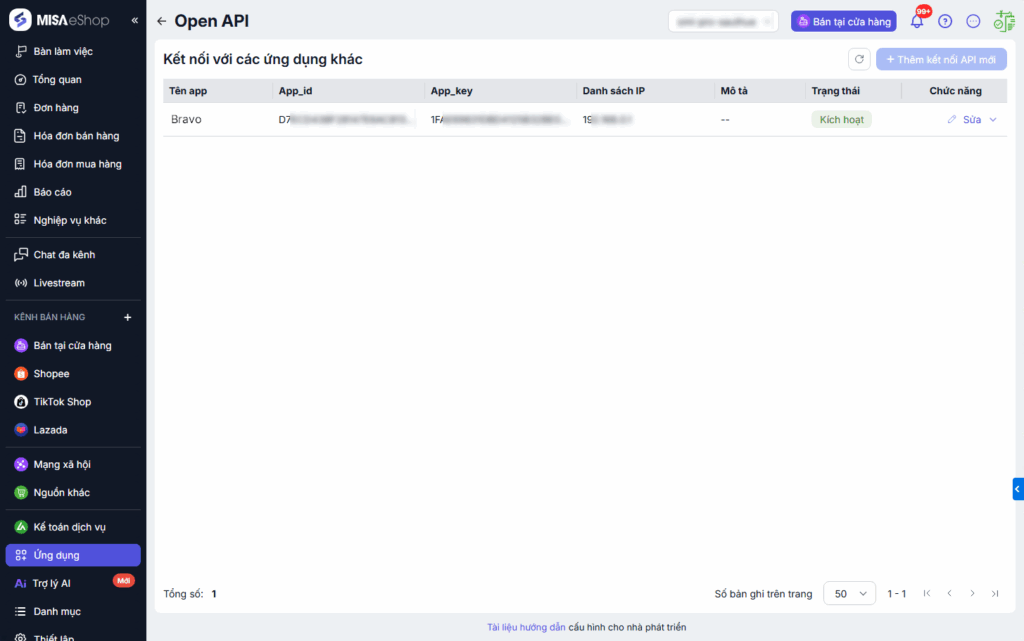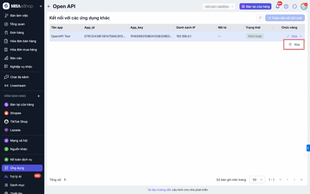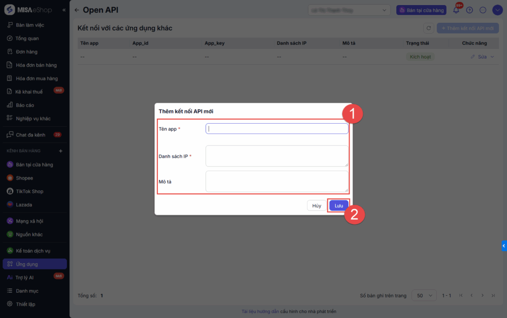 Lưu ý: Một cửa hàng chỉ kết nối được với 1 ứng dụng khác qua Open API.