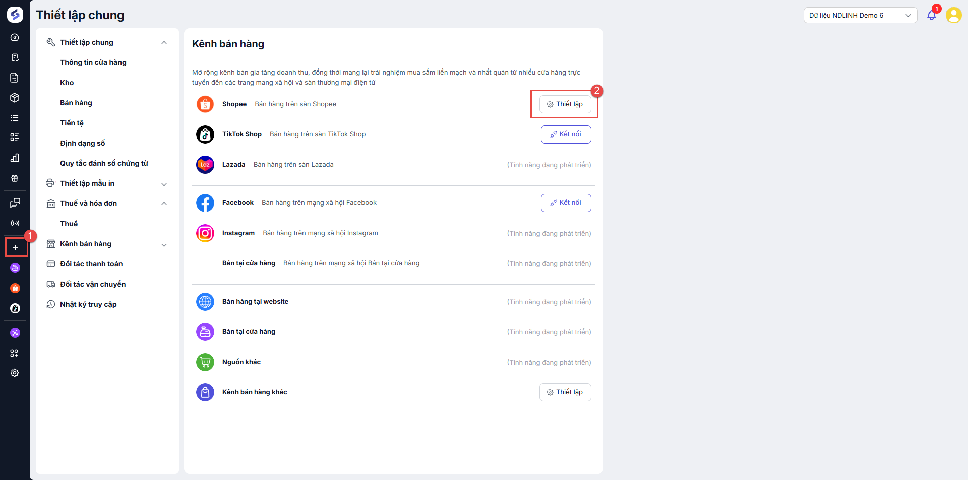 Cách 1. Kết nối qua biểu tượng dấu + trong menu kênh bán hàng