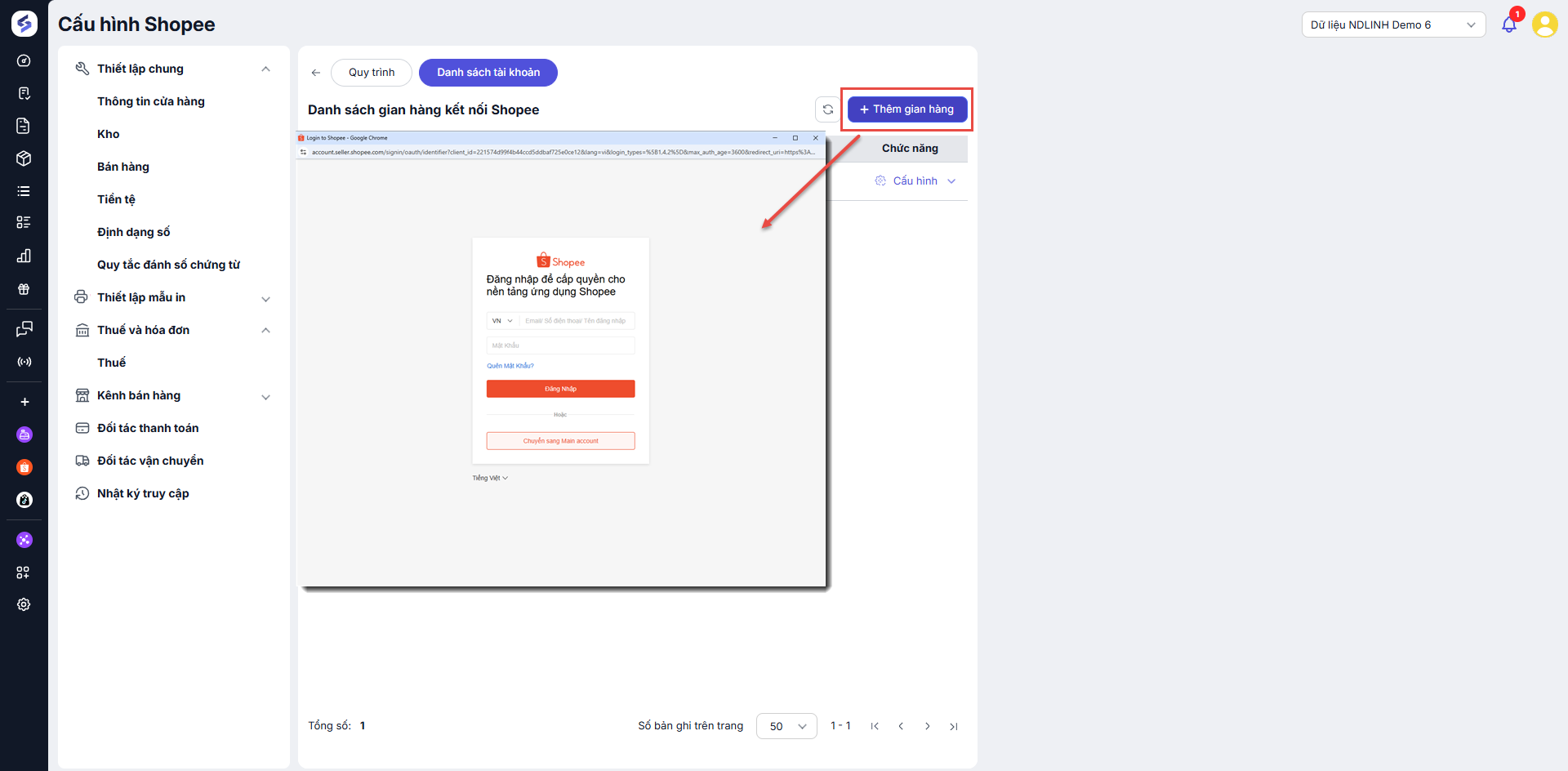 Chọn Thêm gian hàng và sau đó đăng nhập vào tài khoản Shopee bán hàng tương tự như trên.
