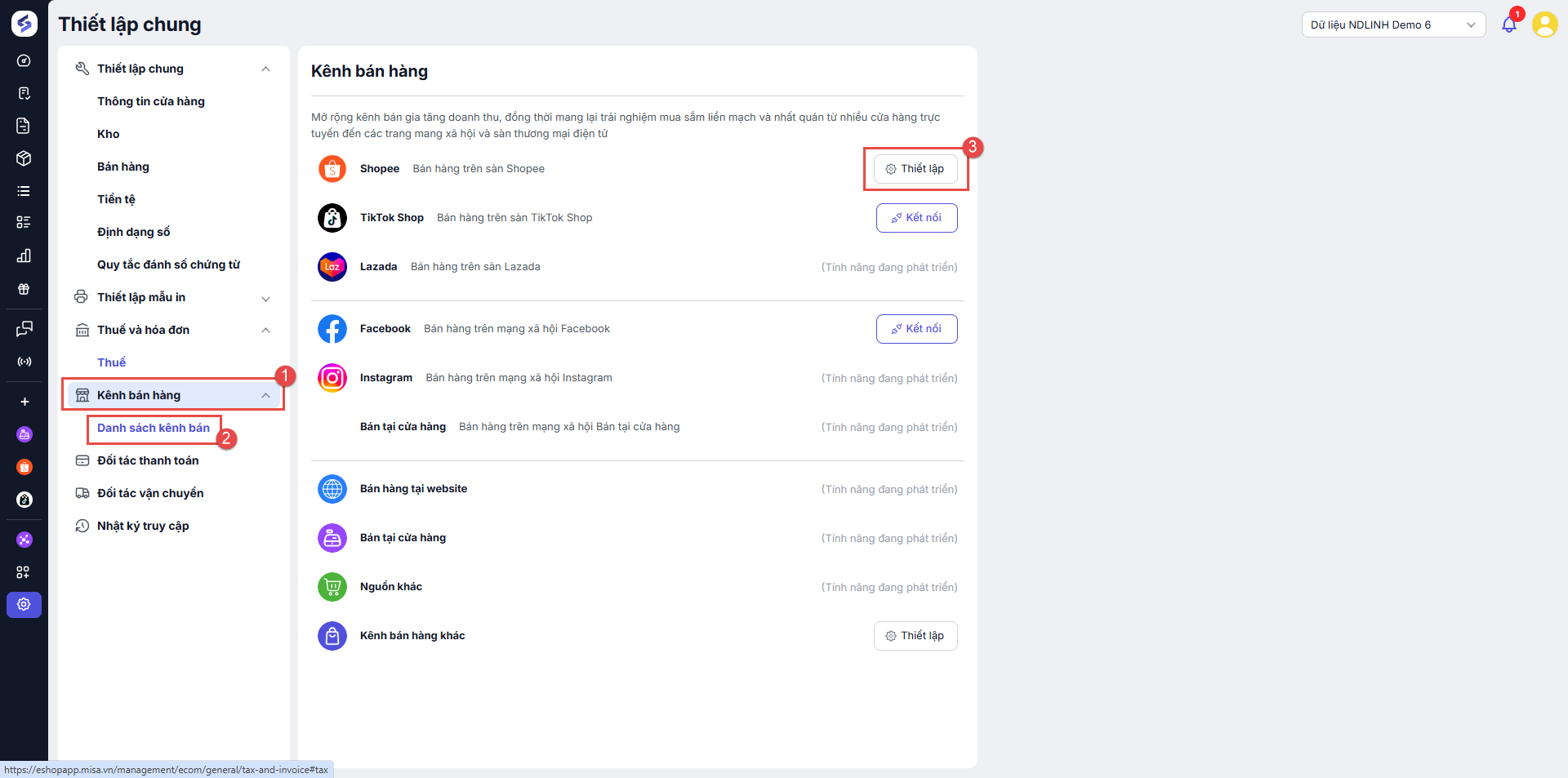 Bước 1: Tại trang Thiết lập -> Kênh báo hàng -> Danh sách kênh bán -> Tại Shopee chọn Thiết lập -> Đồng bộ kho -> chọn Kho trên Misa eShop.