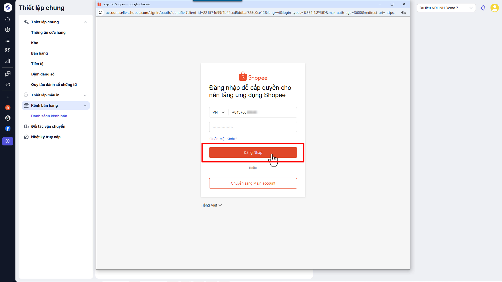 Nhập thông tin tài khoản Shopee bán hàng và nhấn Đăng Nhập.