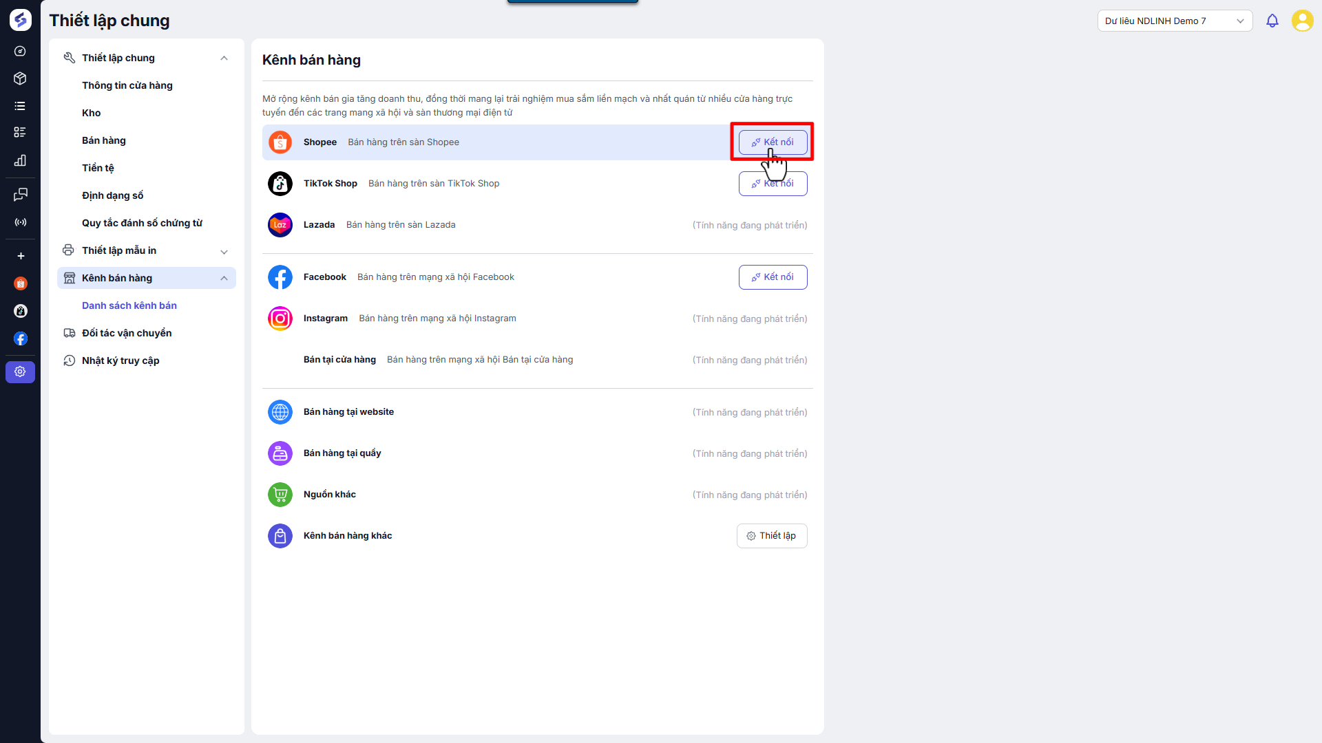 Trong danh sách các kênh bán hàng, nhấn Kết nối Shopee.