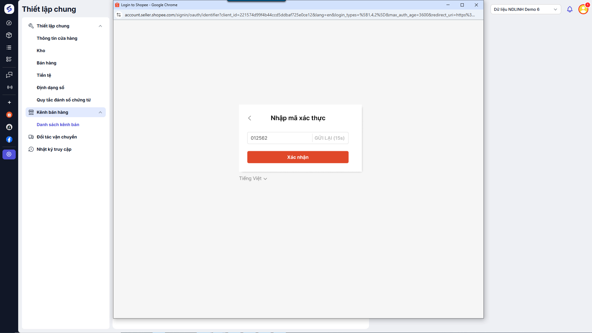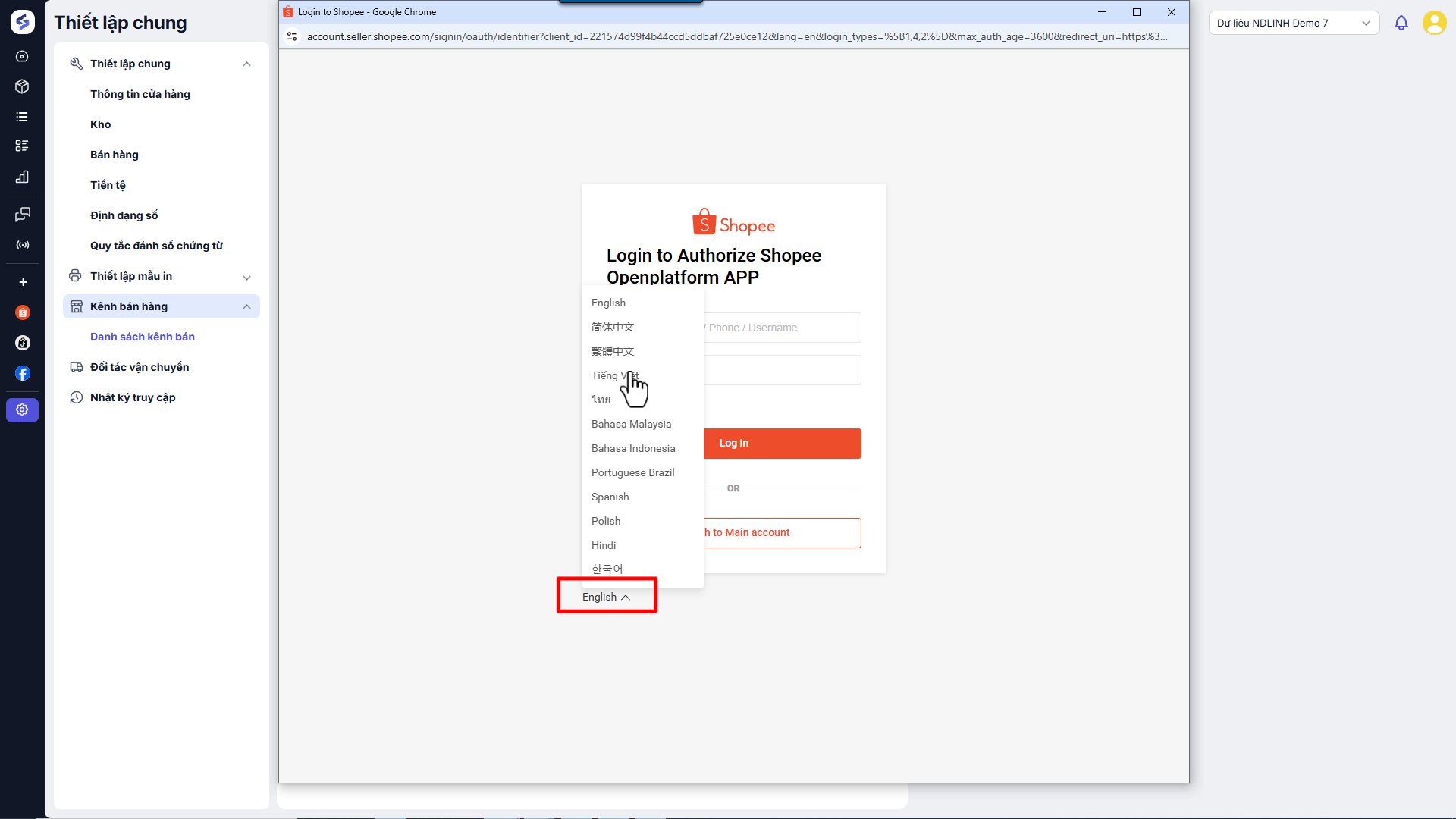 Giao diện kết nối Shopee sẽ xuất hiện. Tại đây, có thể chọn ngôn ngữ Tiếng Việt để dễ thao tác.