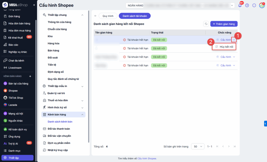 - Tại gian hàng đã ngưng kết nối, chọn chức năng Hủy kết nối
