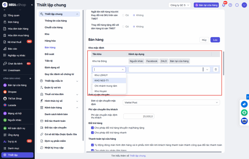 Bước 2: Vào Thiết lập -> Thiết lập chung -> Bán hàng -> Tại kho mặc định, chọn kho cần xuất cho kênh bán Shopee.