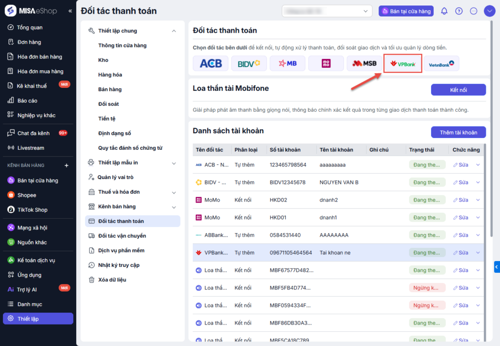 Bước 1: Tại màn hình quản lý, Chọn Thiết lập\Đối tác thanh toán.