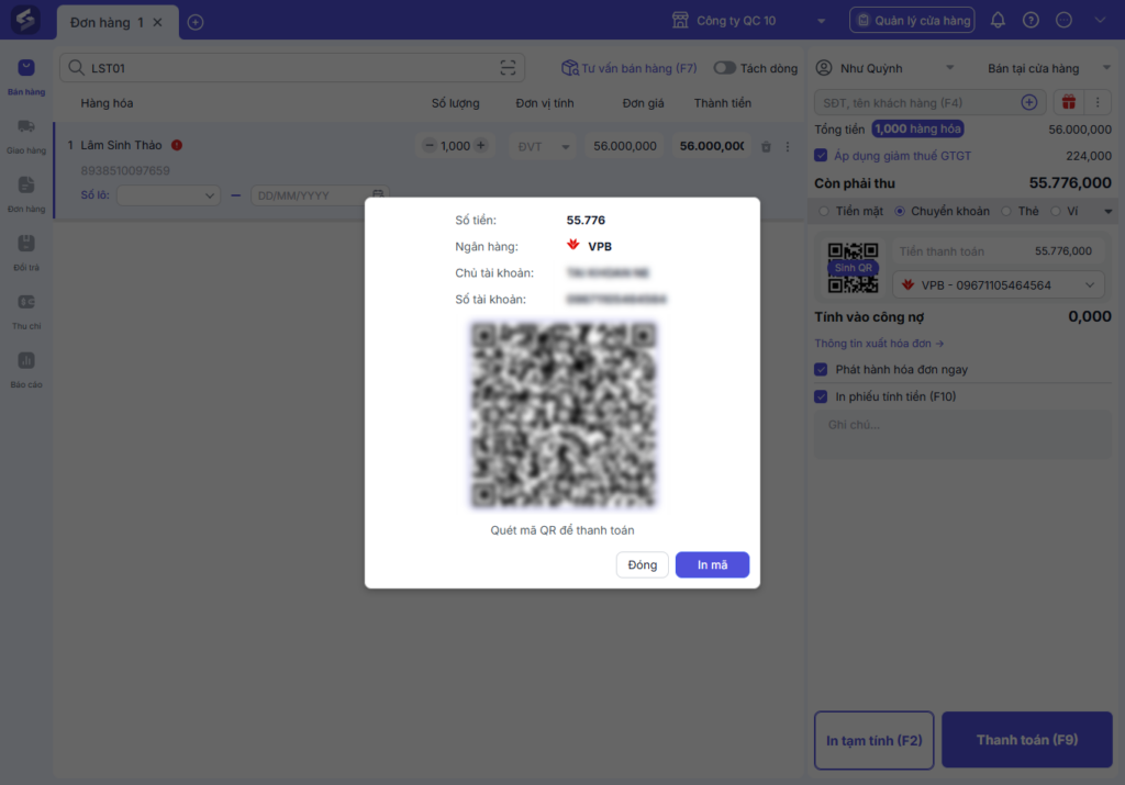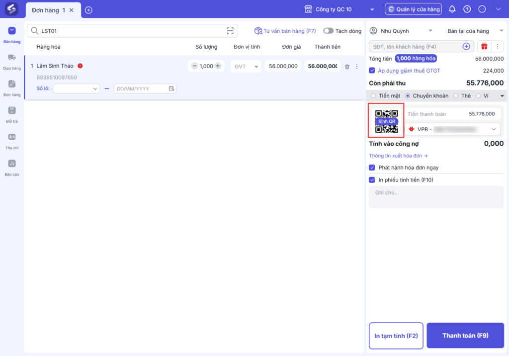 và chọn tài khoản VPBank nhận tiền. - Nhấn Sinh Mã QR để hiển thị mã QR cho khách hàng quét.