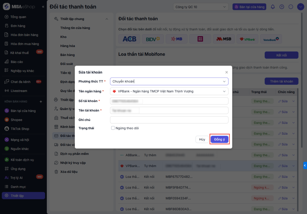 bên cạnh tài khoản và cập nhật thông tin cần thiết. - Tạm ẩn tài khoản: Tích chọn Ngừng theo dõi để tài khoản VPBank không hiển thị trong danh sách lựa chọn tại màn hình bán hàng.