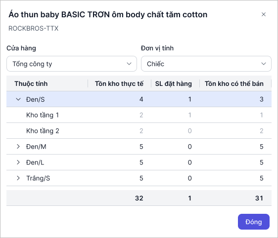 - Nếu hàng hóa có thuộc tính: Hệ thống hiển thị danh sách hàng hóa chi tiết theo thuộc tính và theo từng kho của thuộc tính hàng hóa đó.