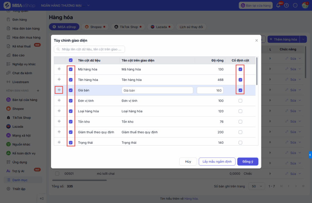 - Người dùng có thể tùy chỉnh lại giao diện danh sách hàng hóa bằng cách: nhấn biểu tượng