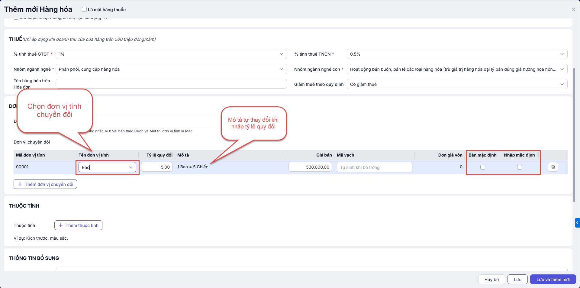 - Bán mặc định: Tích chọn khi hàng hóa được bán chủ yếu với đơn vị tính chuyển đổi.